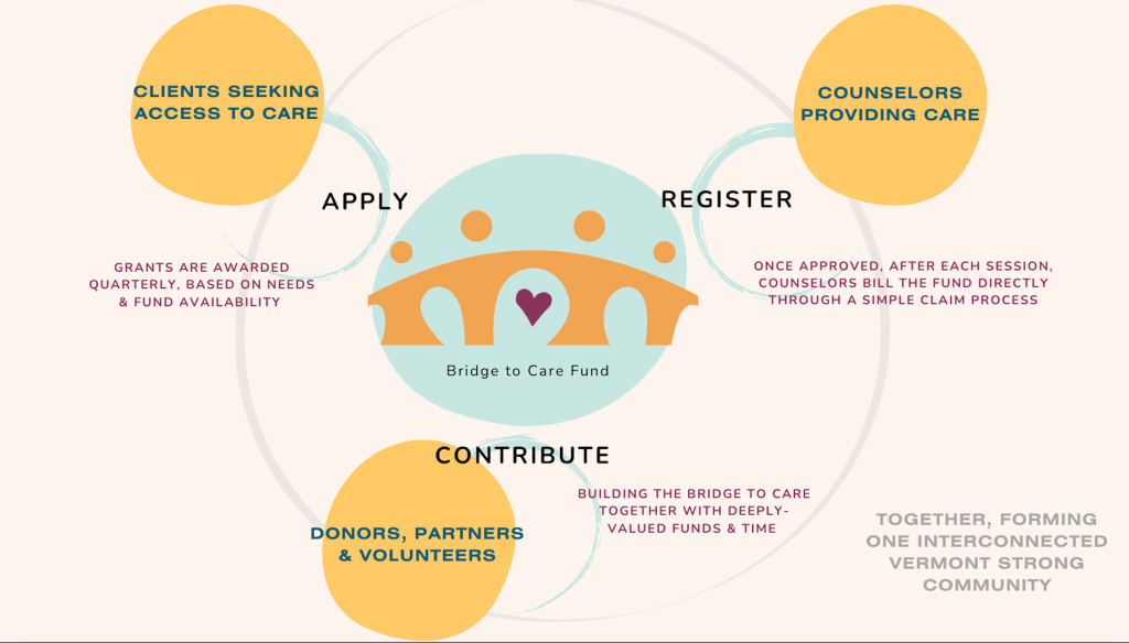 The Bridge to Care Fund exists to increase access to mental health care for Vermonters by supporting both counselors and clients. Here’s how our system operates from start to finish: